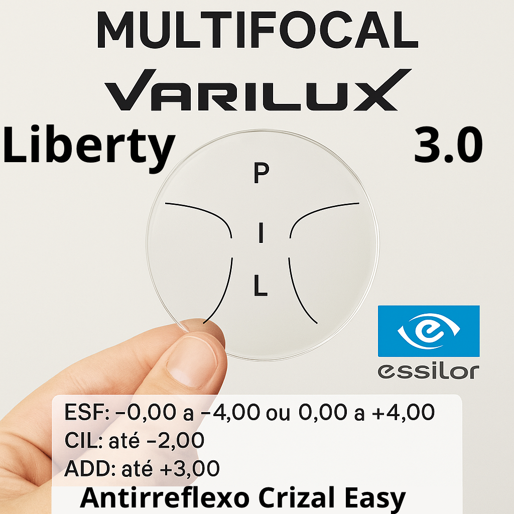 Varilux Liberty 3.0 orma com Antirreflexo Crizal Easy é uma lente multifocal de alta performance desenvolvida pela Essilor, ideal para quem busca conforto visual em todas as distâncias – perto, intermediário e longe – com máxima nitidez.